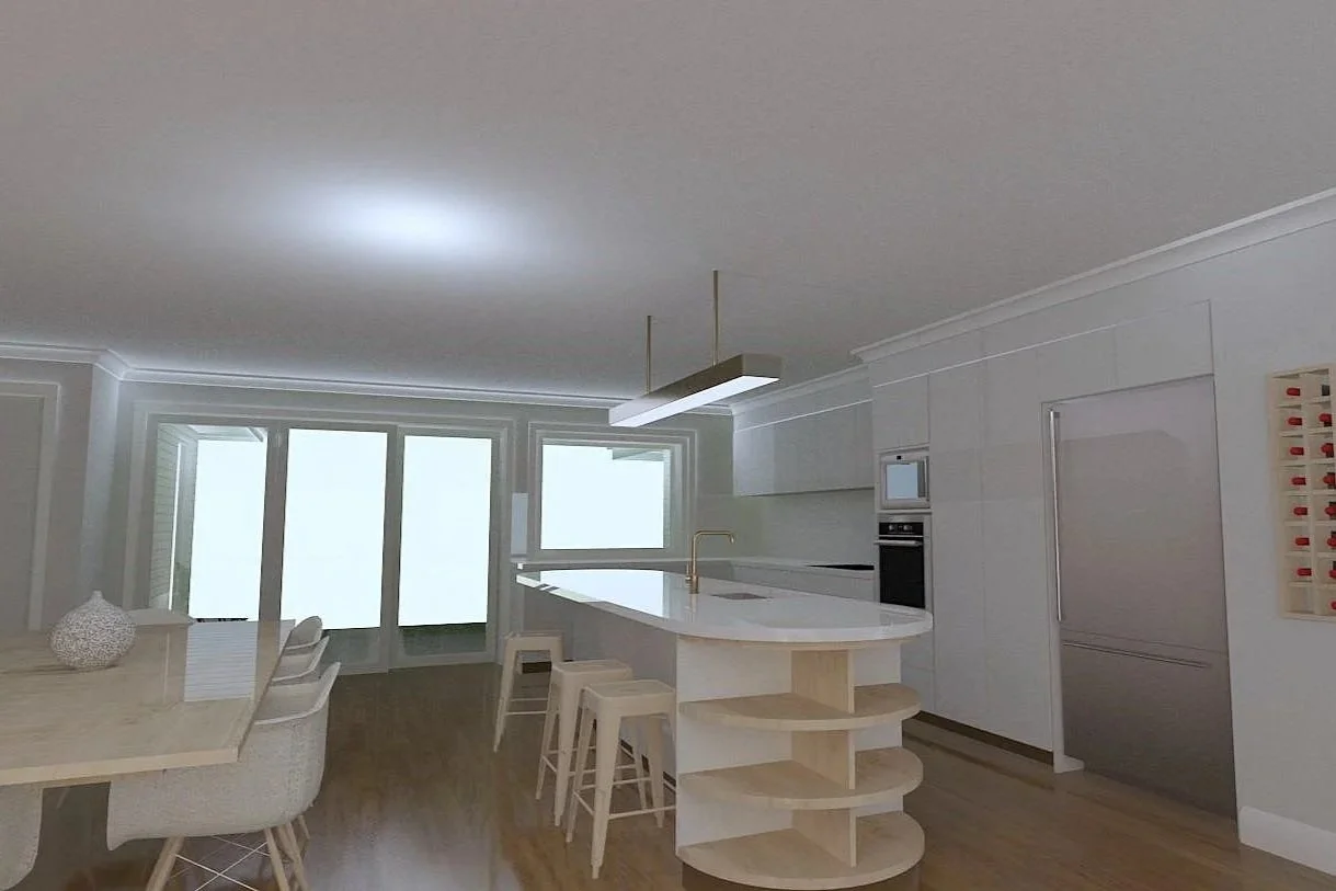 Overview: This a full-scale renovation project that reimagines a well-loved but tired coastal home into a light-filled, modern transitional retreat. The redesign includes a complete interior transformation with bespoke curved feature walls, an open-plan layout, a new roof, and a refreshed façade featuring a striking gable entrance. The brief called for better use of natural light, interiors which emphasised striking views of the ocean, the addition of a third bathroom, and an extended living space that flows seamlessly into a new outdoor entertaining area. Our team is managing the entire build: from refining the interior plans to improve functionality and aesthetic, designing bespoke joinery solutions, to coordinating consultants, trades, and sourcing high-quality materials and fixtures. Currently in progress, this project reflects our commitment to thoughtful, adaptable build practices, client-focussed interior design and hands-on project delivery.