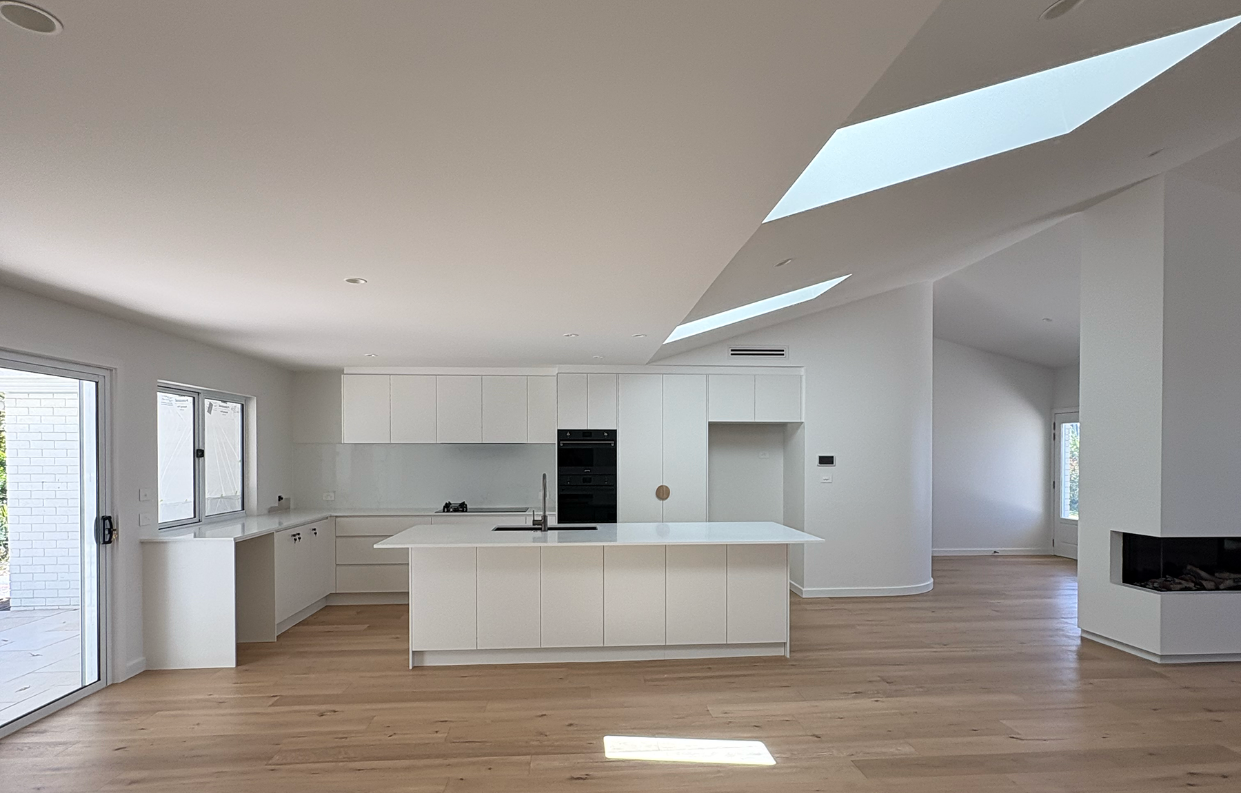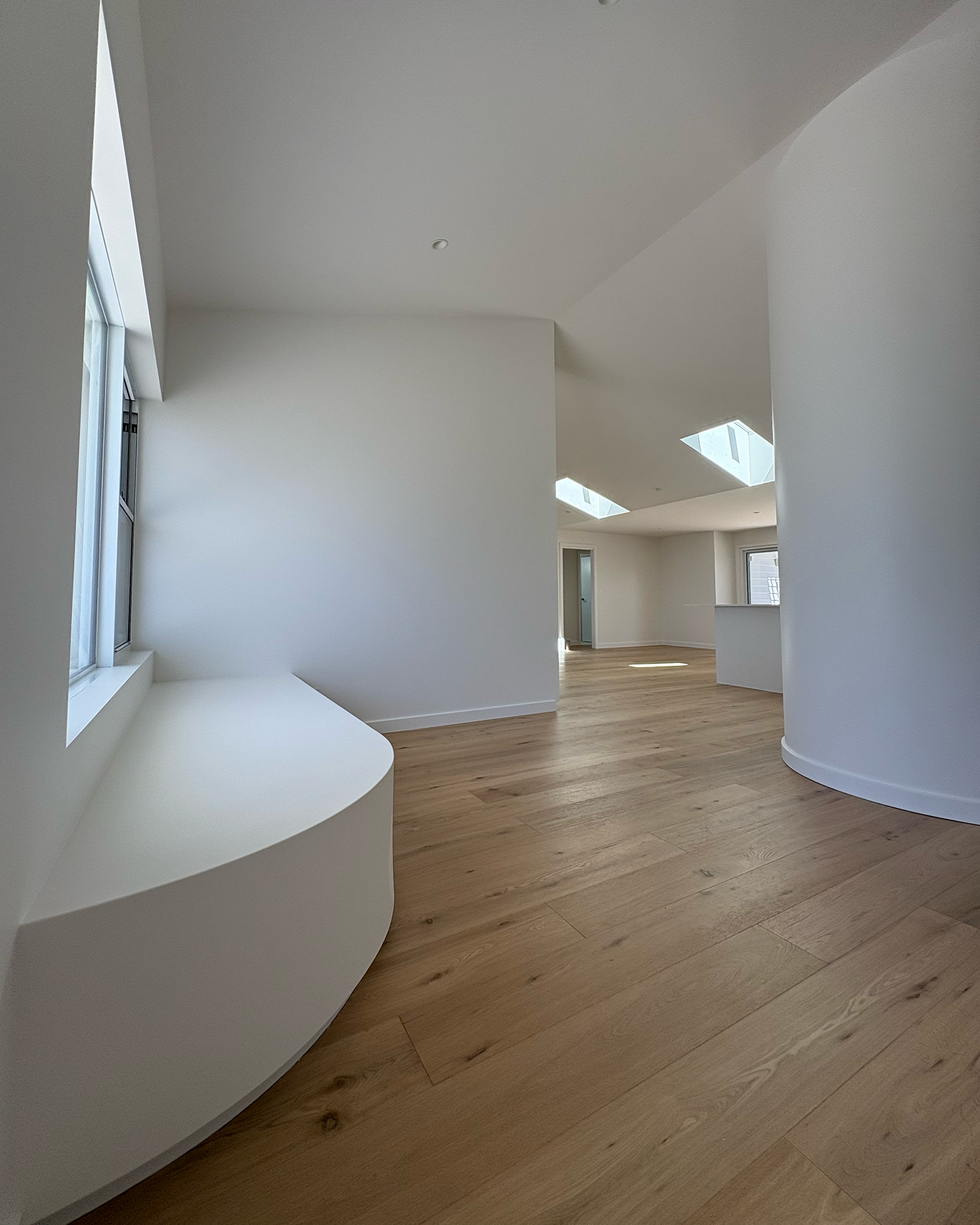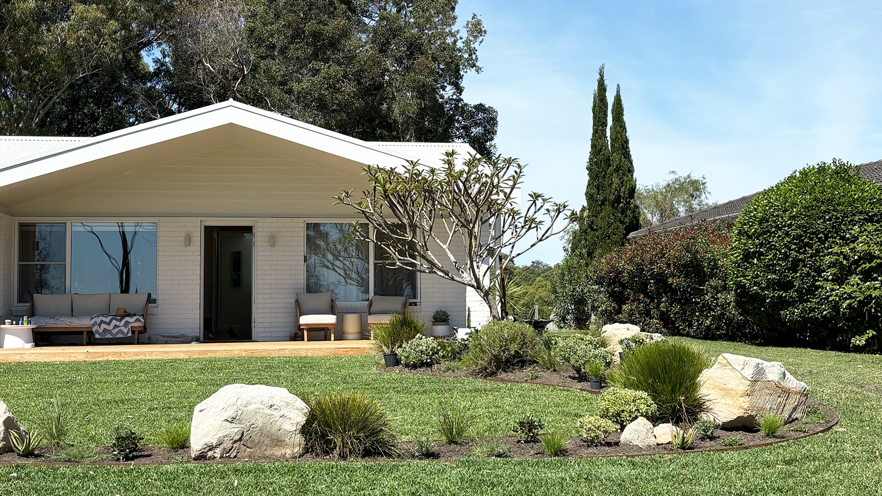 Overview: A full-scale renovation project that reimagining a well-loved but tired coastal home into a light-filled, modern transitional retreat. The redesign includes a complete interior transformation with bespoke curved feature walls, an open-plan layout, a new roof, and a refreshed façade with gable entrance. The brief called for better use of natural light, interiors which emphasised expansive views of the ocean, the addition of a third bathroom, and renovation of two existing bathrooms and a laundry, and a new outdoor entertaining area. Our team managed the entire build: from refining the interior plans to improve functionality and aesthetic, lighting and electrical plans, designing bespoke joinery solutions, coordination consultants, trades, and sourcing high-quality materials .