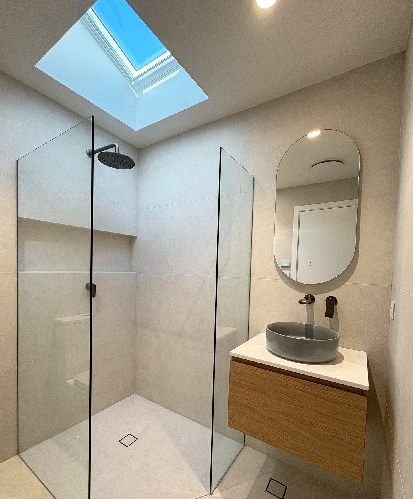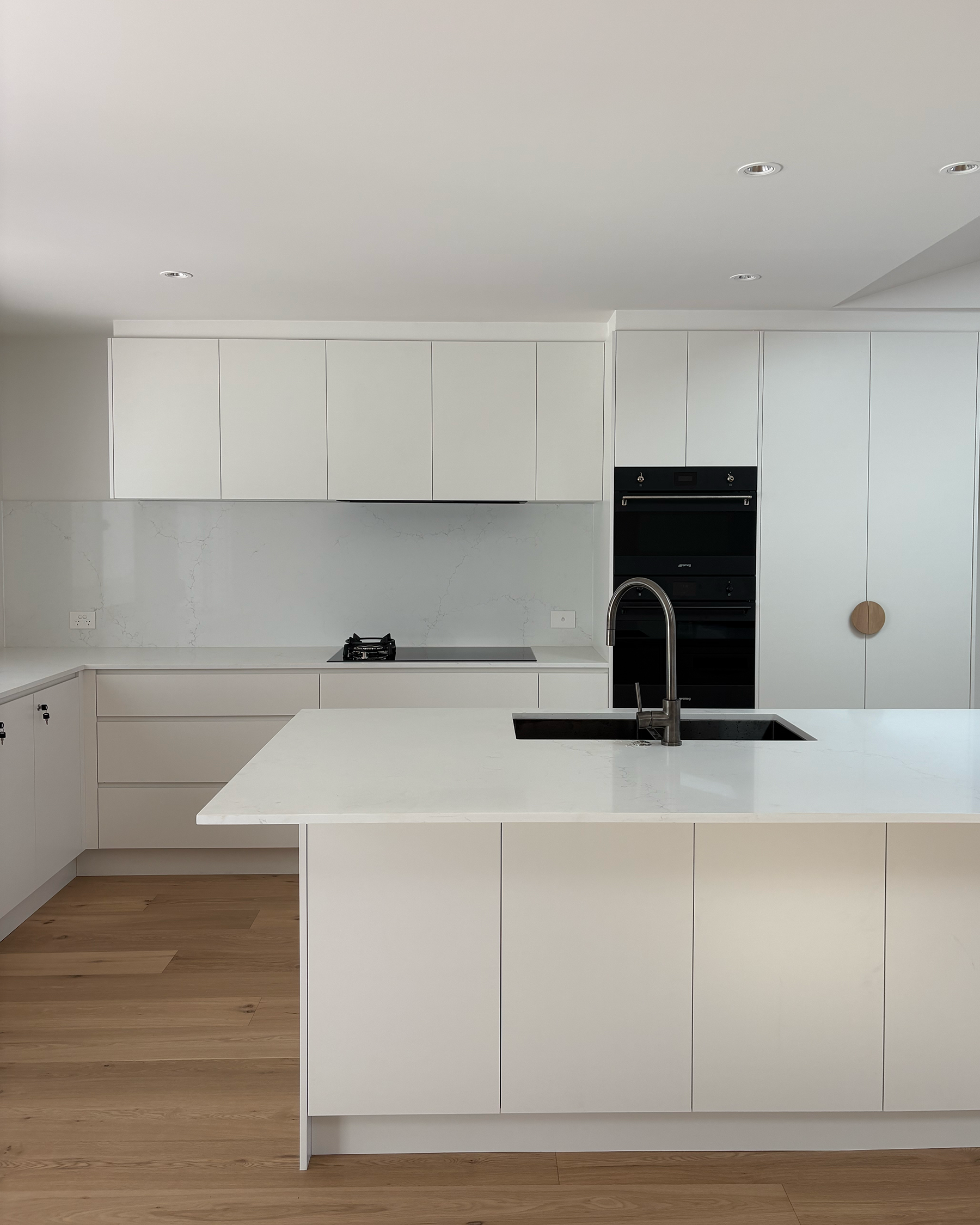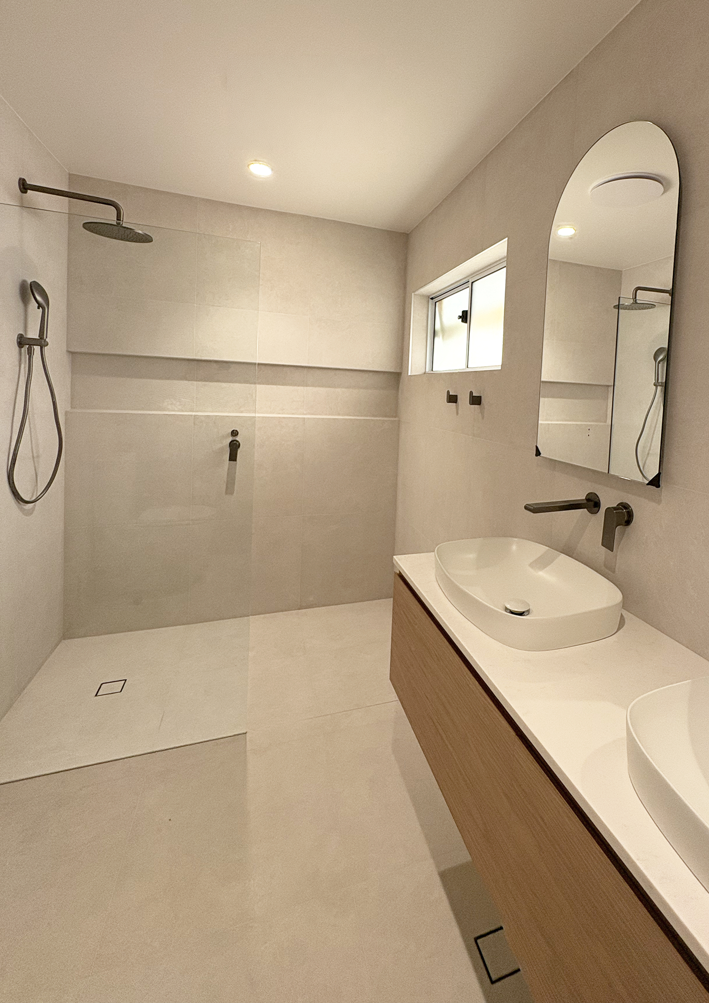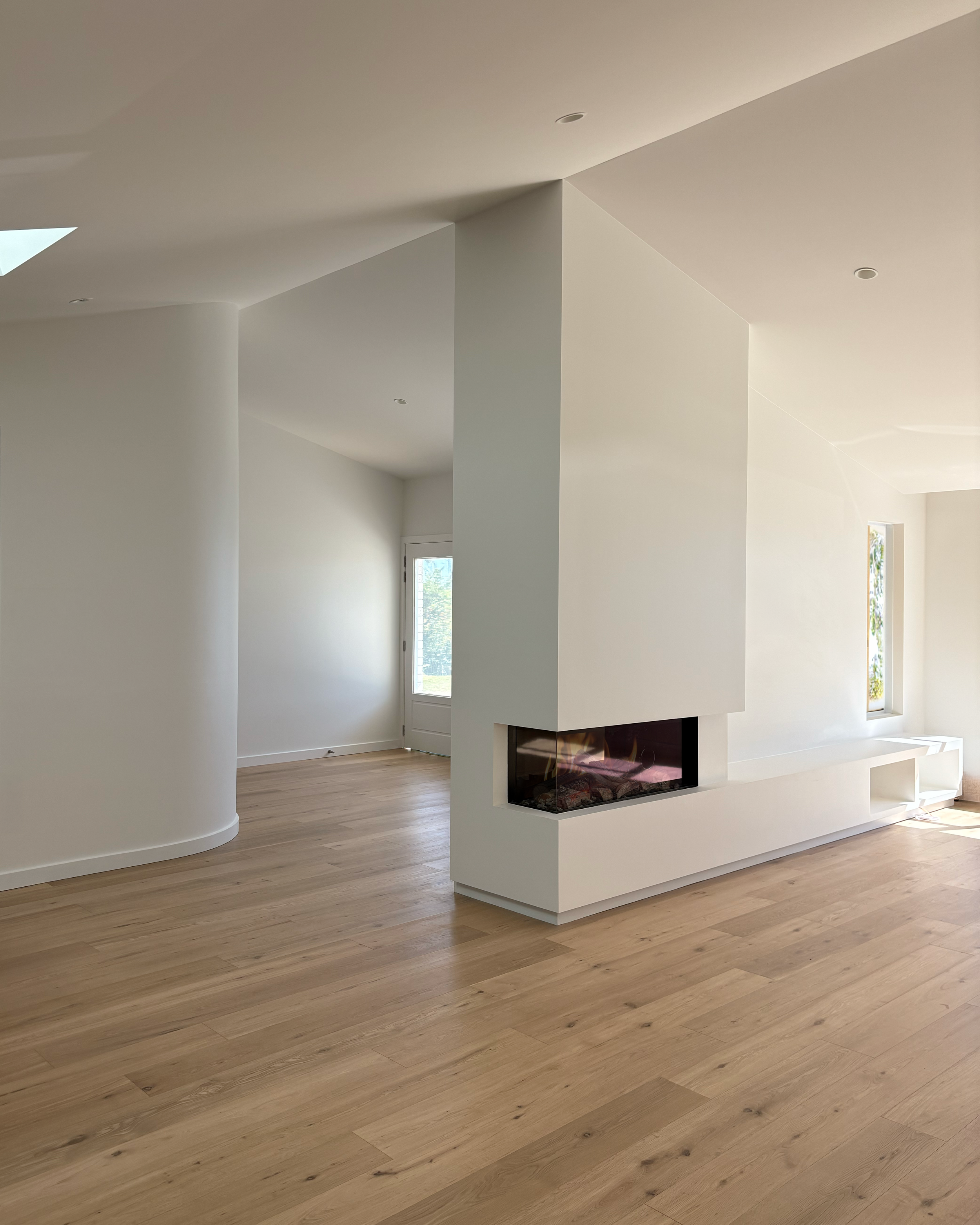 Overview: A full-scale renovation project that reimagining a well-loved but tired coastal home into a light-filled, modern transitional retreat. The redesign includes a complete interior transformation with bespoke curved feature walls, an open-plan layout, a new roof, and a refreshed façade with gable entrance. The brief called for better use of natural light, interiors which emphasised expansive views of the ocean, the addition of a third bathroom, and renovation of two existing bathrooms and a laundry, and a new outdoor entertaining area. Our team managed the entire build: from refining the interior plans to improve functionality and aesthetic, lighting and electrical plans, designing bespoke joinery solutions, coordination consultants, trades, and sourcing high-quality materials .
